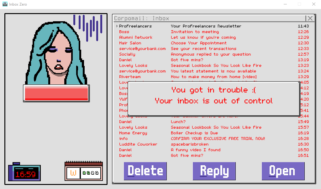 “Your job at Corpolife is tough enough without annoying coworkers, clueless interns and your always-angry boss attacking your inbox. Keep your emails from spiraling out of control, and try to survive until the weekend!”